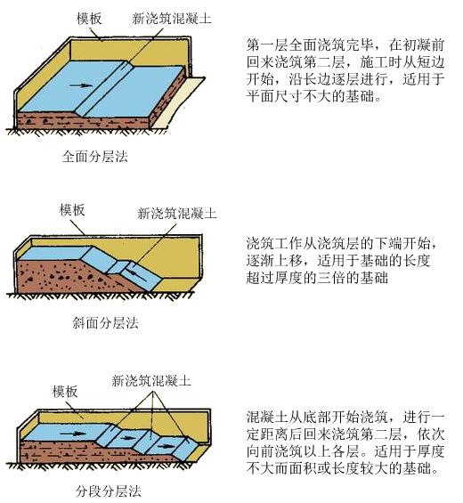 另外,我們?cè)谶M(jìn)行分層澆筑時(shí)還可視情況采用不同的分層澆筑方式進(jìn)行: