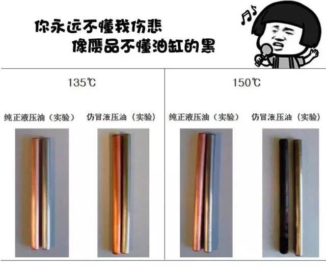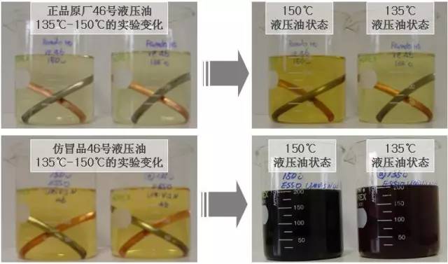 鑒別液壓油的真?zhèn)慰梢院?jiǎn)單的通過觀察油的顏色來判斷,仔細(xì)查看液壓油是否存在顏色過深、渾濁、有雜質(zhì)等情況。為了更直白,我們找來了專家分別將46號(hào)純正液壓油和偽劣液壓油分別放置在135°、150°的高溫下進(jìn)行實(shí)驗(yàn),實(shí)驗(yàn)結(jié)果顯示無論是135°還是150°,純正液壓油顏色都不會(huì)發(fā)生大的變化,仍然是透明油黃色;而仿冒液壓油在高溫環(huán)境下顏色會(huì)變深變黑。