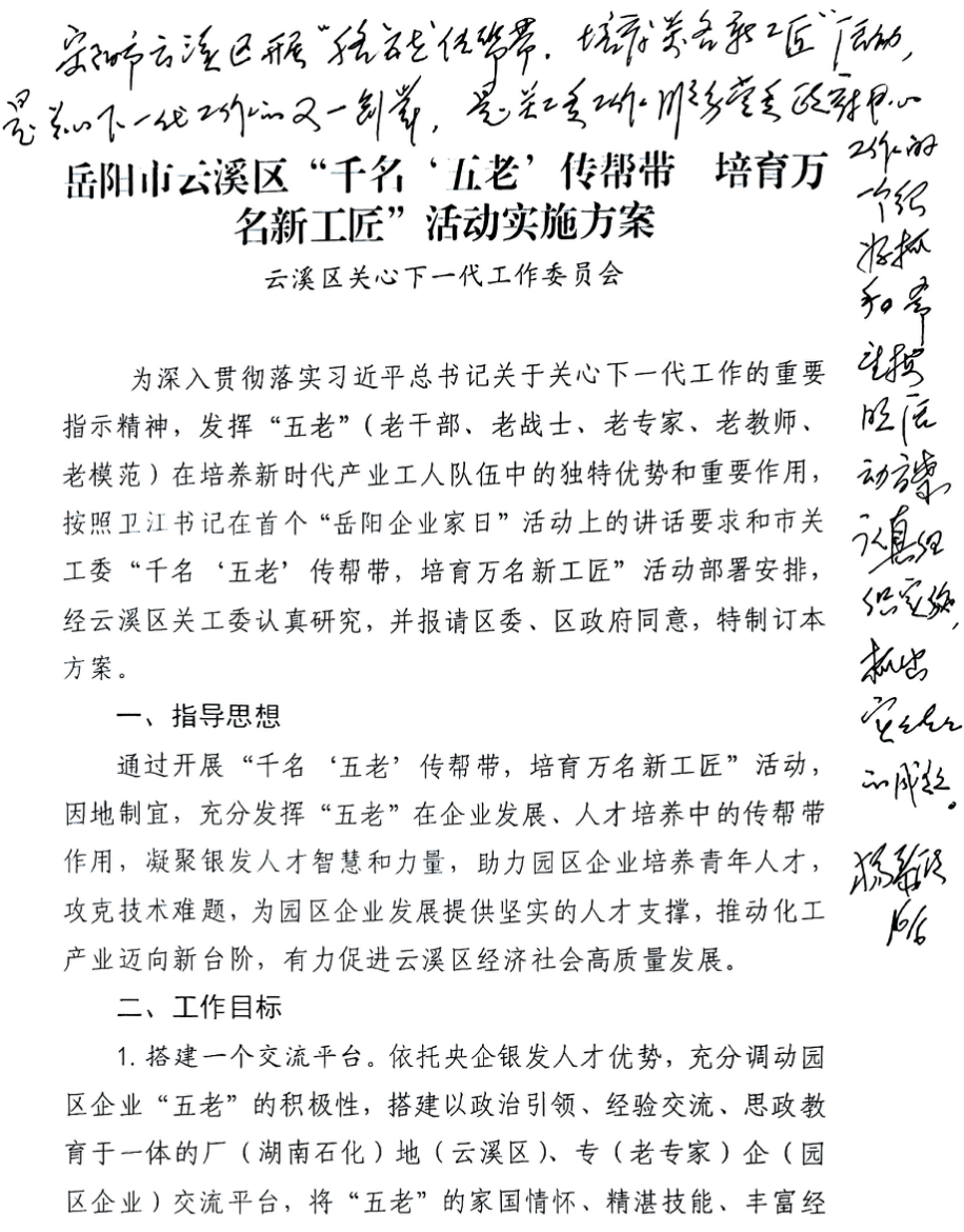 “千名‘五老’傳幫帶,培育萬名新工匠” 活動(dòng)倡議書尊敬的各位“五老”、企業(yè)界的青年朋友、企業(yè)家們:為深入貫徹習(xí)近平總書記關(guān)于關(guān)心下一代工作的一系列指示批示精神,積極響應(yīng)市關(guān)工委的號召,我們在此鄭重發(fā)起 “千名‘五老’(老干部、老戰(zhàn)士、老專家、老教師、老模范)傳幫帶,培育萬名新工匠”活動(dòng)倡議! “五老”引領(lǐng),傳承匠心。各位“五老”是云溪石化產(chǎn)業(yè)發(fā)展的中流砥柱,是云溪大地上行走的奮斗史書,你們用智慧與汗水鑄就了云溪的輝煌,身上所承載的工匠精神和家國情懷,是后輩們?nèi)≈槐M的精神寶藏。在此,我們衷心呼吁各位“五老”,秉持“甘為人梯” 的高尚情懷,積極投身到傳幫帶活動(dòng)中來。將自己多年積累的豐富經(jīng)驗(yàn)、精湛技藝以及對工作的執(zhí)著與熱愛,毫無保留地傳授給云溪的青年一代,成為他們職業(yè)生涯中的“引路人”,讓青年工匠們在你們的帶領(lǐng)下茁壯成長。青年奮進(jìn),砥礪前行。青年是云溪石化產(chǎn)業(yè)的未來之星,肩負(fù)著推動(dòng)云溪高質(zhì)量發(fā)展的重任?!扒謇稀瘋鲙蛶?,培育萬名新工匠”活動(dòng),為青年朋友搭建了難得的成長平臺。希望你們主動(dòng)向“五老”請教,虛心聆聽教誨,認(rèn)真學(xué)習(xí)技術(shù),用心領(lǐng)悟工匠精神的內(nèi)涵,通過不斷的實(shí)踐與探索,鍛造屬于自...