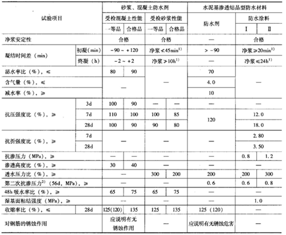 水泥基滲透析晶型防水材料的原料主要包括不飽和聚酯樹脂、甲基丙烯酸甲酯、吸水樹脂,這些成分在混凝土中具有良好的滲透能力,很快進入混凝土的孔隙,堵塞孔洞,起到防水抗?jié)B的作用。防水劑技術(shù)指標(biāo)要求見表2-1。
